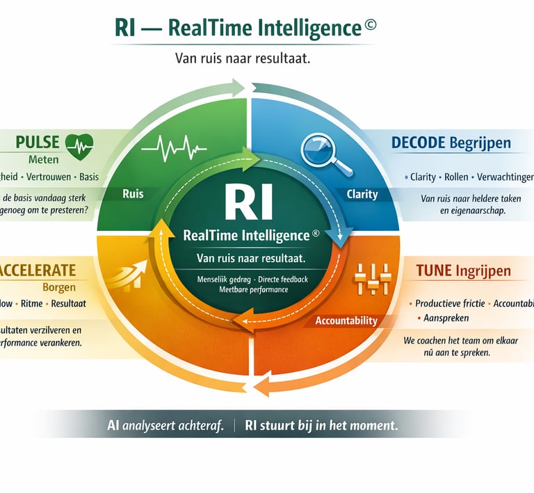 De RI-methode© (RealTime Intelligence) helpt teams om in het moment grip te krijgen op hun samenwerking en prestaties. Waar veel analyses achteraf plaatsvinden, stuurt RI real-time bij — precies daar waar gedrag, keuzes en interactie ontstaan.